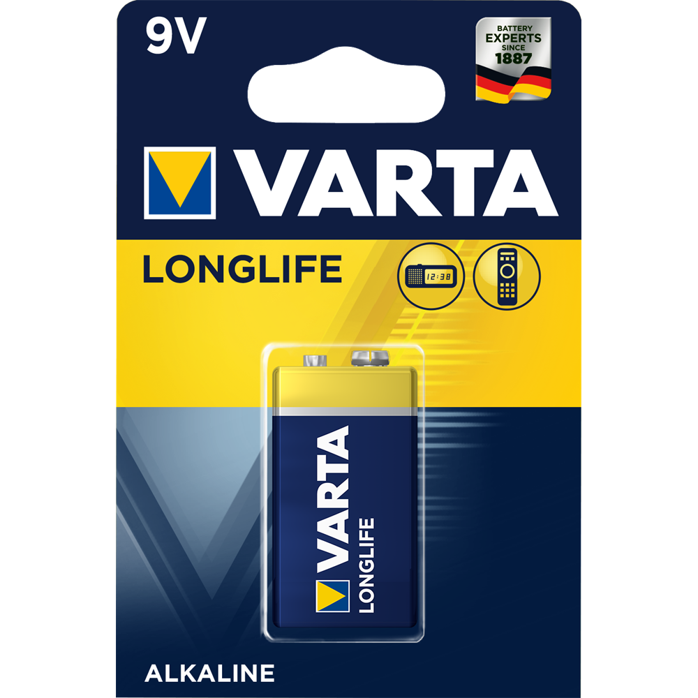 Hosszantartó energiaellátás az állandó, alacsony energiafogyasztású készülékekhez, például ébresztő- és faliórákhoz, kisebb elemlámpákhoz, távirányítókhoz stb. Az ajánlott használat – piktogramok révén – világosan ábrázolt módja. A legfontosabb terméktípusok átlátszó csomagolásának elején, a termék eredetének bizonyságaként „Made in Germany” (Készült Németországban) felirat. A „Single Press Out” (egyszerűen kipattintható) technika lehetővé teszi a csomagolás könnyű kinyitását, valamint a még használatlan Varta Longlife 6LR61 E 9V alkáli elemek tárolását