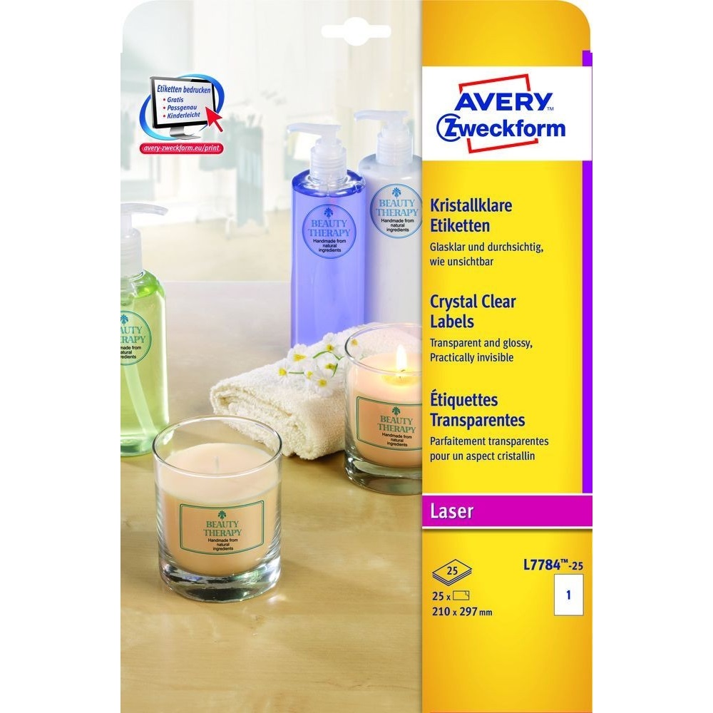 Etikett címke, 210 x297mm,víztiszta, 1 címke/ív, 25 ív/doboz, Avery átlátszó