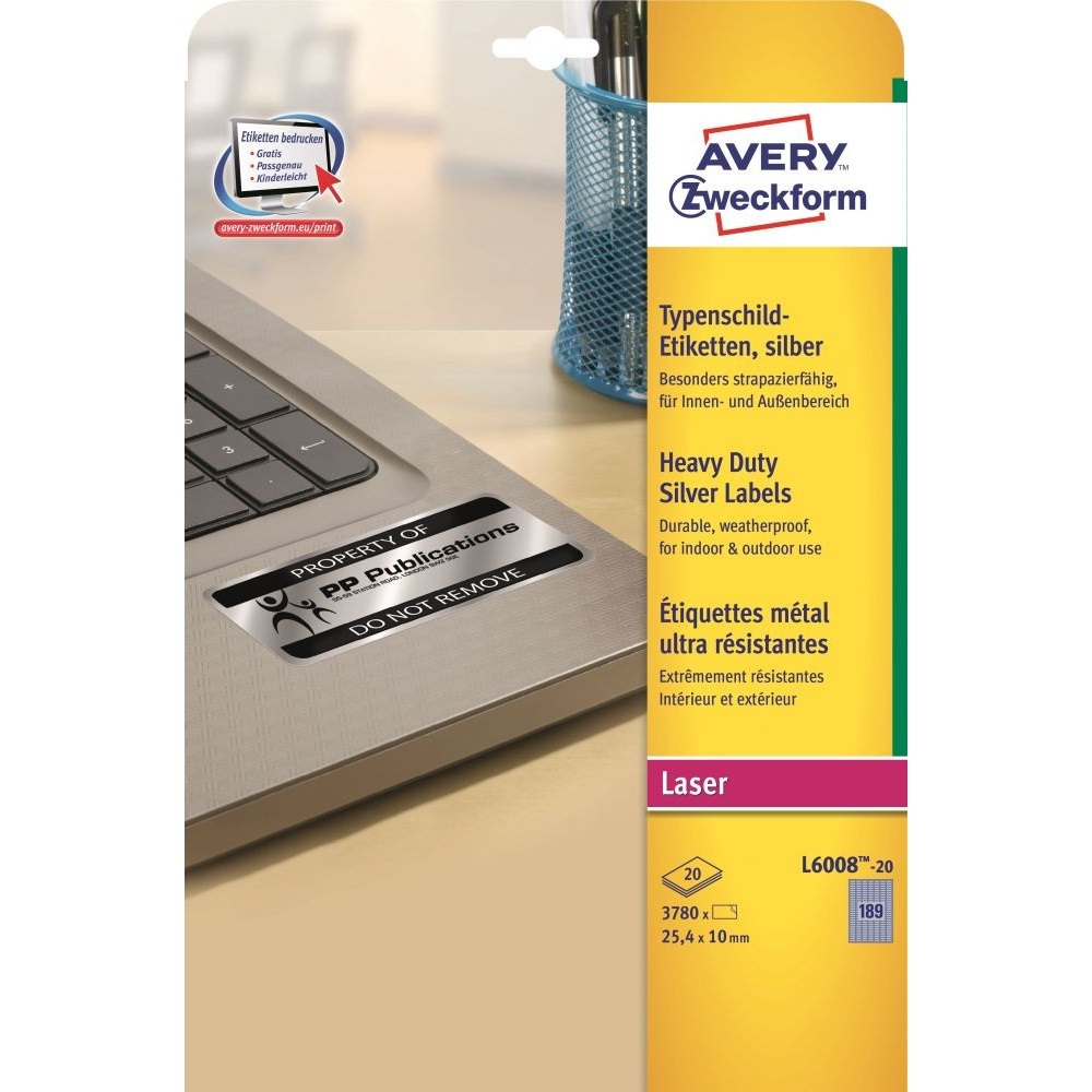 Ezüst poliészter címke, strapabíró időjárásálló címkéi lézernyomtatókhoz kifejezetten a tulajdon tárgyaink megbízható és professzionális felcímkézéséhez fejlesztve készültek. A strapabíró, poliészter filmből készült etikettek olaj, szennyeződés-, UV- és hőállóak (-40°C és +150°C között), vízállóak és szakadásbiztosak. Az ezüst ipari etikettek tökéletesek például vállalatok tulajdonainak, elektronikai berendezéseinek és azok alkatrészeinek felcímkézésére. Tervezze meg és nyomtassa ki ezüst ipari címkéit gyorsan és egyszerűen – ingyenes szoftverünkért és sablonjainkért látogasson el a http://www.avery.hu/templates-software/ weboldalra vagy használja a Microsoft® Office csomagokba beépített sablonjainkat! Kifejezetten lézernyomtatókhoz fejlesztve.