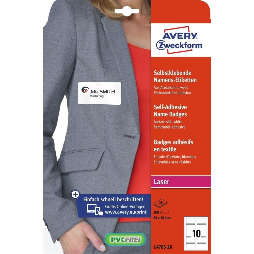 Öntapadó, visszaszedhető, lézernyomtatókhoz kifejlesztett névcímkék nagyszerű segítséget nyújtanak a konferenciákhoz és rendezvényekhez. Az acetátselyem névcímkék megbízhatóan tapadnak ruhákon és textíliákon, ugyanakkor egyszerűen, ragasztómaradvány nélkül eltávolíthatóak a ruházat megóvása mellett. Könnyedén leválasztható és újra visszahelyezhető, tárolható a hordozón a következő használatig. Tervezze meg az arculatot és nyomtassa ki a nevét gyorsan és egyszerűen – az ingyenes szoftverünkért és sablonjainkért látogasson el a http://www.avery.hu/templates-software/ weboldalra.