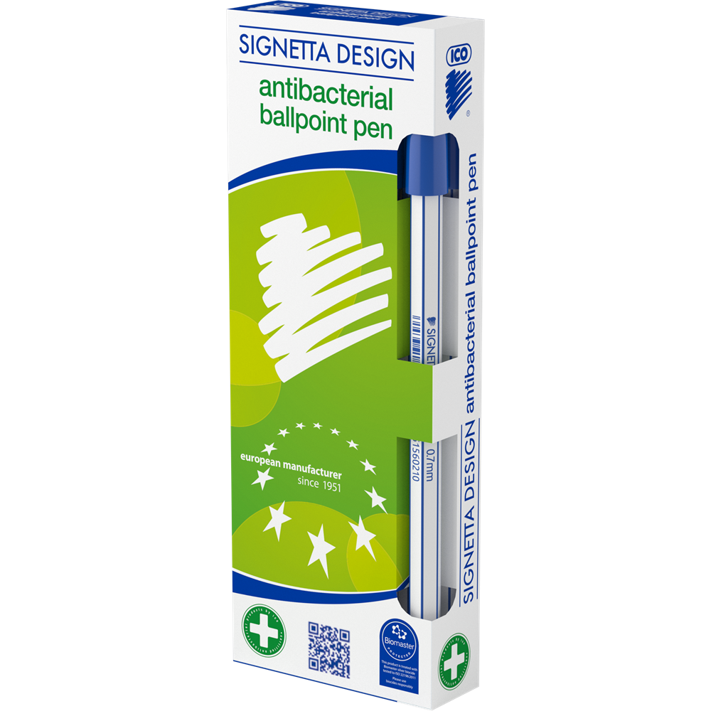 Antibakteriális eldobható golyóstoll biztonsági kupakkal. A műanyag alkatrészek antibakteriális védelmet adó Biomaster ezüst-ionokat tartalmaznak (biocid hatóanyag: ezüst-foszfát üveg). Az ICO Antibakteriális termékei bizonyítottan baktériumölő tulajdonsággal rendelkeznek, a felszínen megtelepedett kórokozók 24 óra leforgása alatt, 99,9% hatékonysággal elpusztulnak. Az antibakteriális hatást az angliai Industrial Microbiological Services Ltd. bevizsgálta és igazolta. Regisztrációs szám: 3264423. Vonalvastagság: 0,7 mm. Íráshossz: 2500 m. Írószín: kék.
