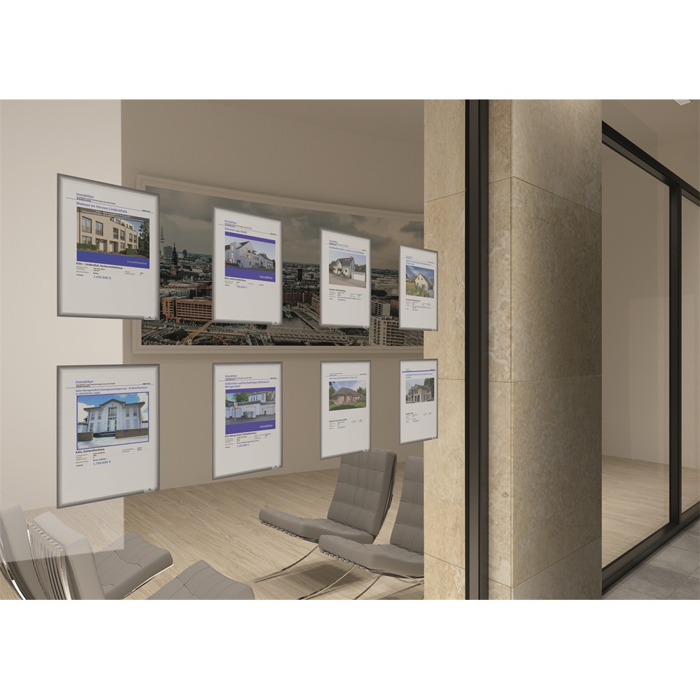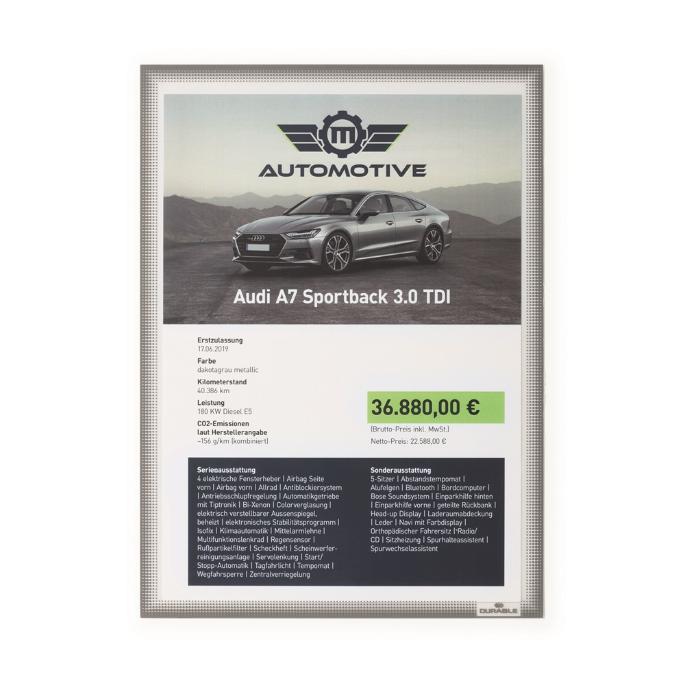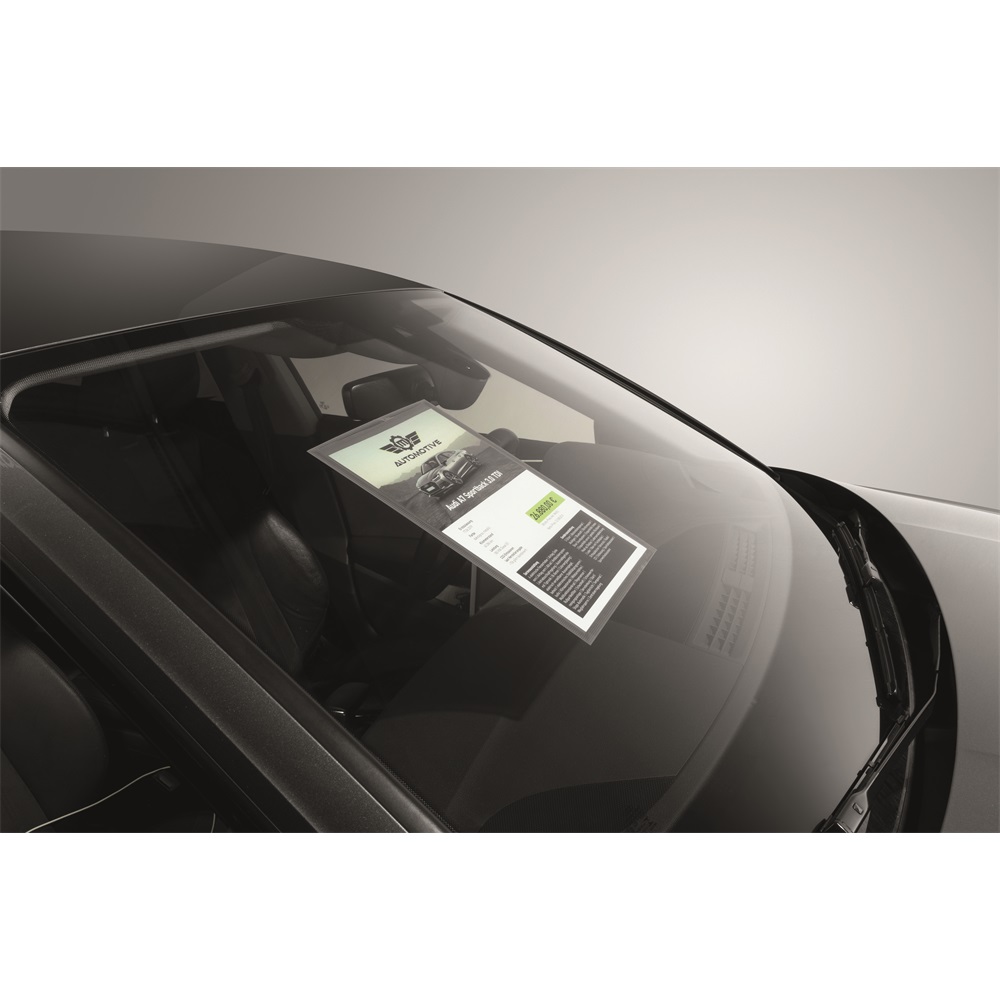 Feliratozási megoldás ívelt üvegfelületek számára: A statikusan tapadó információs tasakok alkalmasak arra, hogy ajánlatokat helyezzünk ki velük az autó ablakaira, kirakatokba, vagy kínáló pultok üveg felületeire. Az öntapadó keret statikus úton (ragasztómentes) rögzül. Hőálló és stabil kb. 70°C-ig, UV-álló 2 évig, Nyom nélkül eltávolítható – újrafelhasználható. Könnyű dokumentumcsere a hátlapon elhelyezett kivágásnak köszönhetően. Belső méretek: 303 mm x 216 mm (M x SZ), Külső méretek: 323 mm x 236 mm (M x SZ).