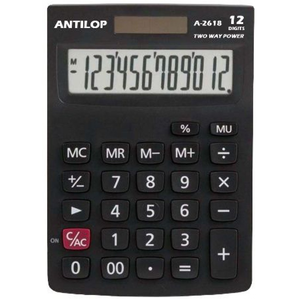 Antilop A2618 fekete asztali számológép 12 számjegyű nagy kijelző, memória funkció, százalékszámítás, haszonrés számítás, 00, előjel váltás, vissza léptetés és alapműveletek.