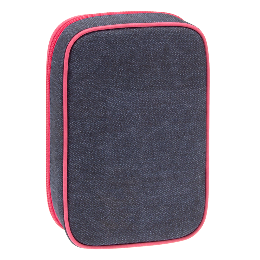 Többszintes, töltetlen, cipzáras tolltartó. Belül textillel bevont merev lapokkal, gumis kialakítással 30 ceruza számára az írószerek tárolásához és egy cipzáras belső zsebbel.