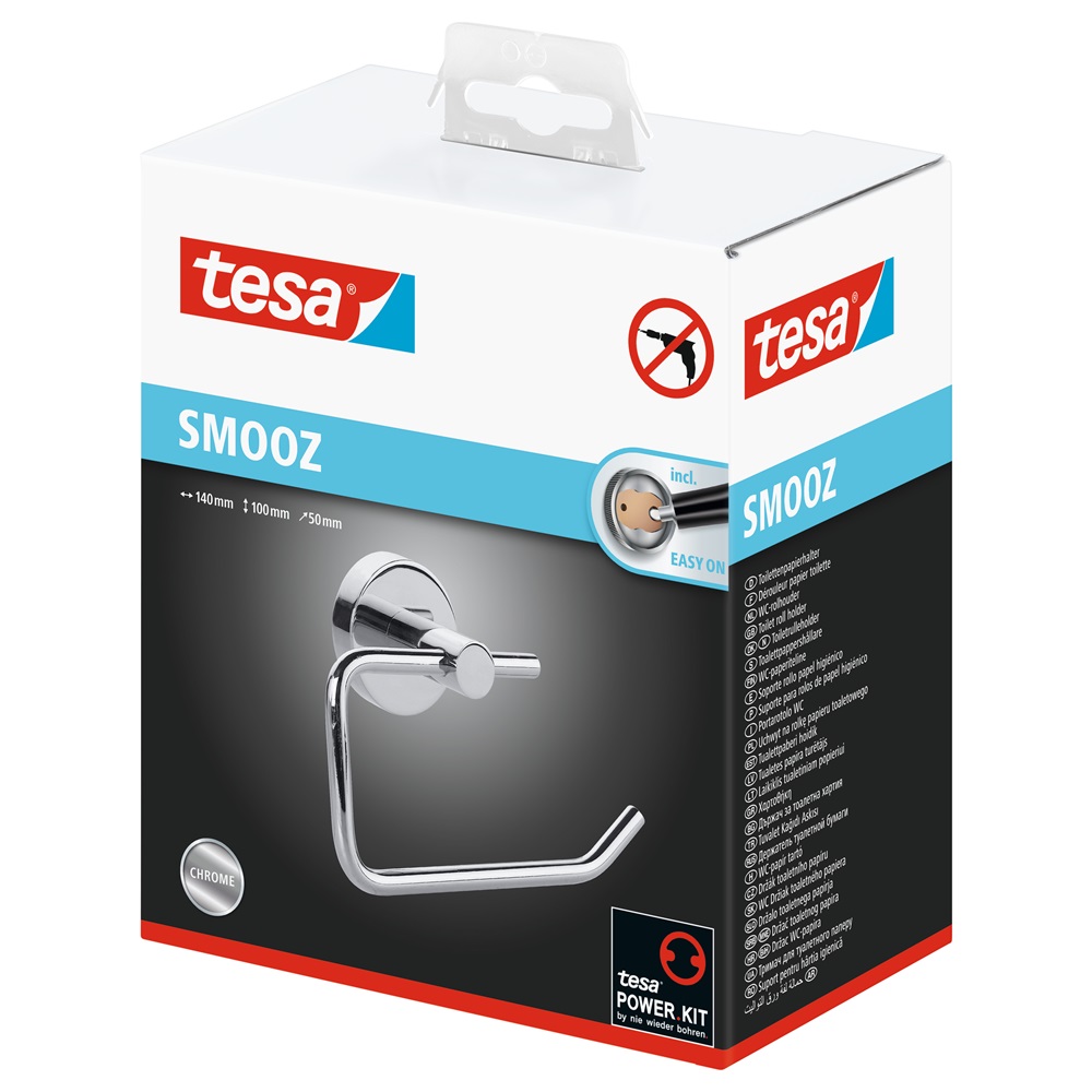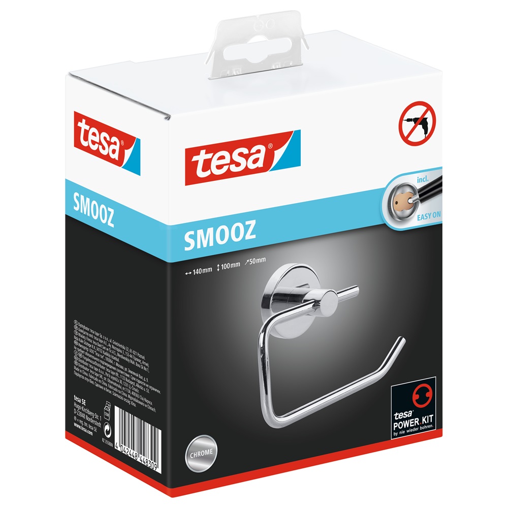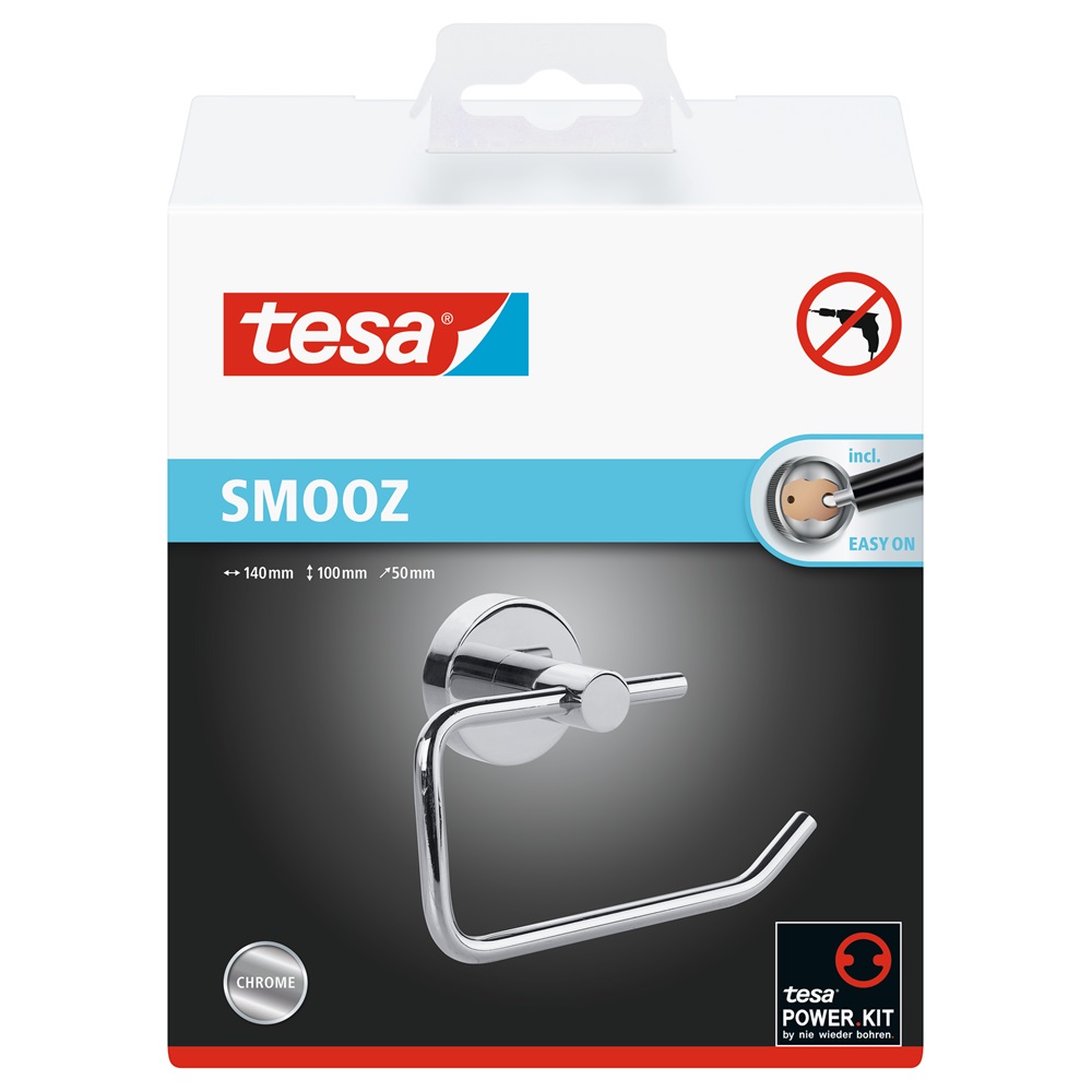 A ragasztós rögzítésű tesa® SMOOZ WC-papír tartót egyszerű és egyben gyönyörű kialakítás fémjelzi, ráadásul könnyen és megbízhatóan rögzíthető a falra. Nincs szükség fúrásra, így nem sérülnek a felületek. A tartót könnyen, nyom nélkül el lehet távolítani és újra lehet használni egy új BK20 adapterrel.